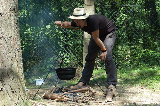 Egyébként hajnalban rendhagyó tamtamdobos, gitározós táborlakózavarósat koncerteztünk, aholis köttetett egy fogadás, miszerint a pénteki napon nem alszunk. Hát emberek, szégyen vagy nem, nem bírtam a virrasztást délután mint Csipkerózsika hajtottam kis kék sátramban álomra fejem. Nem segített rajtam az iszonyatfinom gulyás sem. Amit egyébként sokoldalú, gulyásszakértő politikusaink osztályoztak. És hogy mi a jó gulyás titka? A nyertes csapat receptje: „ad1: A jó gulyás alapja, hagymát hagymával kell enni, ad2:gulyáshoz szánt bor fele a szákácsokba megy“ Páhuzamosan a gulyásfőzéssel a füstben folyt a pólófestős workshop Zselinszky Miroszlaval és Baranyovics Borisszal, ahol ízléseteknek megfelelően bármily meglepő pólóitokra és egyéb ruhadarabjaitokra festettethetek, ez az akció a szombati napon is folytatódik .