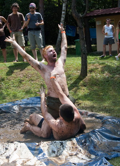 Hátra volt még a kidobós játék, azt hiszem, az emberek nagy részének általános iskolás emlékfoszlányaiban „vybijaná” néven szerepel ez a csodás labdajáték. Kisebb-nagyobb félreértések és szabálymódosítások után lezajlottak a mérkőzések, egy-egy téves bírói döntés után pedig a játékosok inkább egymást dobálták meg, nem a bírót, köszönöm mindenkinek… A tájfutás maradt utolsó versenyszámnak, a klasszikus útvonalon, a tábortól a várig kellett futni, különböző feladatokat teljesítve: versrészlet megjegyzése (Lewis Carroll: Szajkóhukky), sörivás, uborkaevés, favágás, memóriajáték, almakiszedegetés egy nagy kanna vízből kéz nélkül… mindezt időre kellett teljesíteni. Az átlagidő huszonöt perc körül mozgott, az egyik csoportnak (hadd maradjanak a névtelenség jótékony homályában) mindezt sikerült negyvenhárom perc alatt lefutni, ki tudja, mi minden történt velük út közben, egy biztos, a jó hangulatot minden állomáson biztosították.
