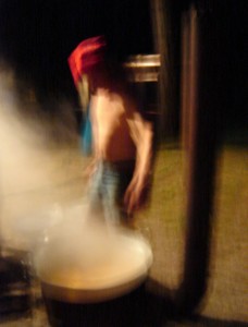 Keverjed! Igyál egy sört és gyújts rá. Aztán nézd meg a tegnap éjjel beáztatott indokolatlan mennyiségű babot (huuu!!! ez tényleg ennyi lett???) és segédeszközök által tégy annyit a katlanba, amennyi belefér (segédeszköz = két kezed). Puhítsad. Még… Igyál egy sört, gyújtsál rá. Pályinka. Kóstolás: ha nem elég sós, ne vidd túlzásba, még jön bele káposzta! Sör. Közbe kevergessed és gyönyörködj az illatában. Ignoráljad a félrészeg embereket, akik nagyon igyekszenek belepotyogni a katlanba – lesz még rosszabb. Közben kóstolgass savanyú káposztát, csavard ki a levét. Az mindegy, hogy csíííp! Igyál sört. Gyújtsál rá. Ha elég puhának látod a babot, vagy ha már nagyon közeleg a vacsi ideje, igyál sört, egy felest, és osztd el a két katlanba a káposztát. Sör, kóstolás, ízesítés. Cigi. Ha már majdnem kész, ülj le, és pihenj le öt percre – később lehetetlen lesz! Aztán várd a főszervezőt, hogy rohanva kóstolja meg és elismerően biccentsen: ez igen jó lett!