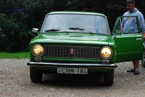 A történethez hozzátartozik, hogy Karina és a két másik medikus még véletlenül se ismerte egymást, csak akkor kerültek kapcsolatba, amikor ő, én, meg Veroni, közismertebb nevén Csiga, elindultunk, hogy feltöltsük készleteinket a faluban. Viszont szombat délután volt, ezért kicsi volt a valószínűsége, hogy nyitva lesz bármilyen bolt is, de azért meg akartuk próbálni. A tábor bejáratánál találkoztunk a két úriemberrel, akik épp a képen látható, kis zöld zsigulijukba pakoltak. Megkérdeztük, hogy el-e vinnének minket a faluig, ők azzal a feltétellel egyeztek bele, hogy mivel kevés a hely, mindhármunknak fognunk kell egy-egy üveget a csehszlovák üdítőitalból. Ezt persze meg is tettük, nekem speciel egy, a kocsihoz képest hatalmas méretű vízipipa jutott. Útközben kiderültek a közös gyökerek, álmélkodtunk persze, hogy kicsi a világ (nagy közhely, de igaz, nem?). A faluban aztán szembesültünk a szomorú valósággal, mármint, hogy az üzlet zártabb már nem is lehetne, ezért egy hirtelen döntéssel velük maradtunk, ugyanis épp a rozsnyói Tescóba tartottak, gondoltuk, visszafele majd stoppolunk. Megtudtuk tőlük, hogy mennyire megérte nekik ennyit utazni a Bëlga miatt, mert sokkal jobban bejött nekik ez a családias koncert, és az, hogy nem kellett keresztülverekedniük magukat a fesztiválokhoz hasonló tömegen, hogy az első sorokban csápolhassanak. A tábor hangulata is nagyon tetszett nekik, nem is beszélve az alacsony árakról, és a pénteken levizitelt Magas-Tátráról. Az út maga amúgy viszonylag eseménytelenül telt, csak egy, az úton komótosan átballagó tehénen álmélkodtunk (Csallóközben nem látni ilyet, no), meg láttunk két médiasátras kolleginát, akik ezúttal nem Párizsba, csak vissza a táborba stoppoltak.